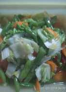 1/2 bonggol sawi putih, pisahkan daun dan batangnya, iris, 10 batang buncis, potong2, 1 buah wortel, potong2, 2 buah crabstik (opsional), potong2, 2 siung bawang putih, cincang, 1 siung bawang merah, cincang, 3/4 sdt kaldu bubuk, 3/4 sdt garam, 1/5 sdt merica, 300 ml air.